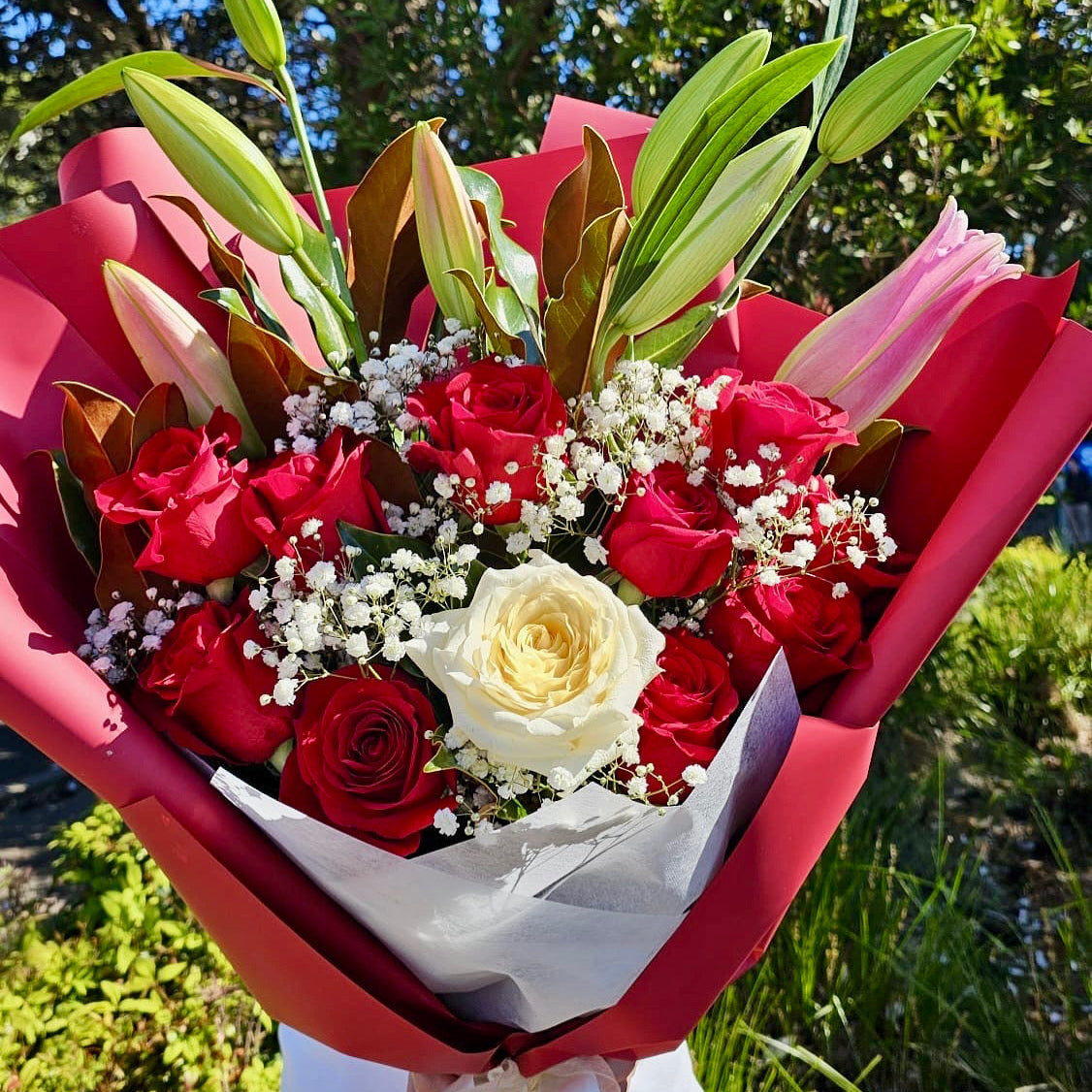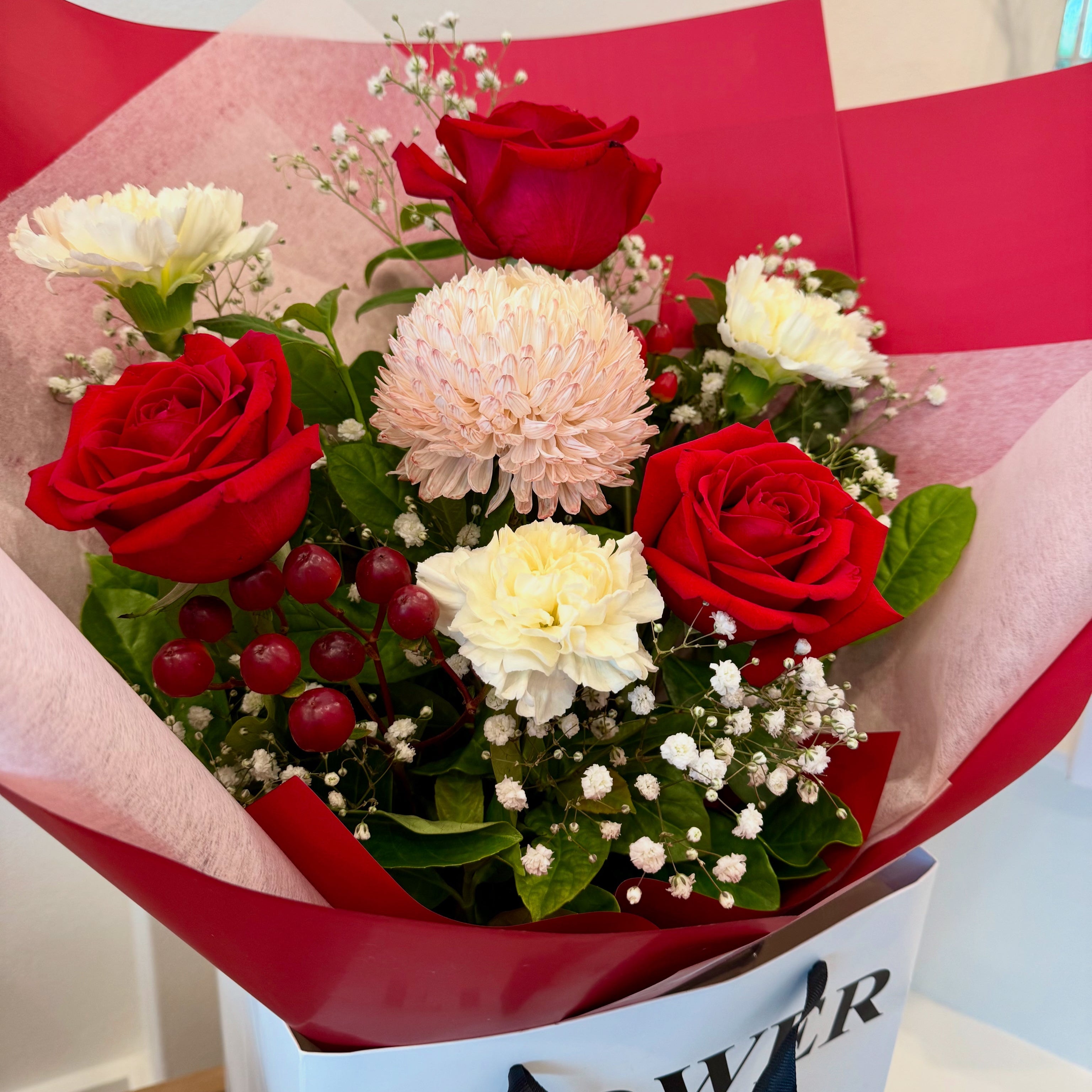 Blushing Flame Standard BouquetA captivating mix of red and blush tones symbolising love, admiration, and confidence โค๏ธ๐ท. Perfect for anniversaries, romantic gestures, or celebrating someone who lights up your world. โจ๐ Please note: Flowers may vary slightly depending on seasonal availability ๐ฟ.