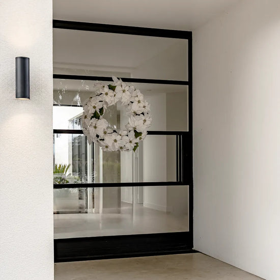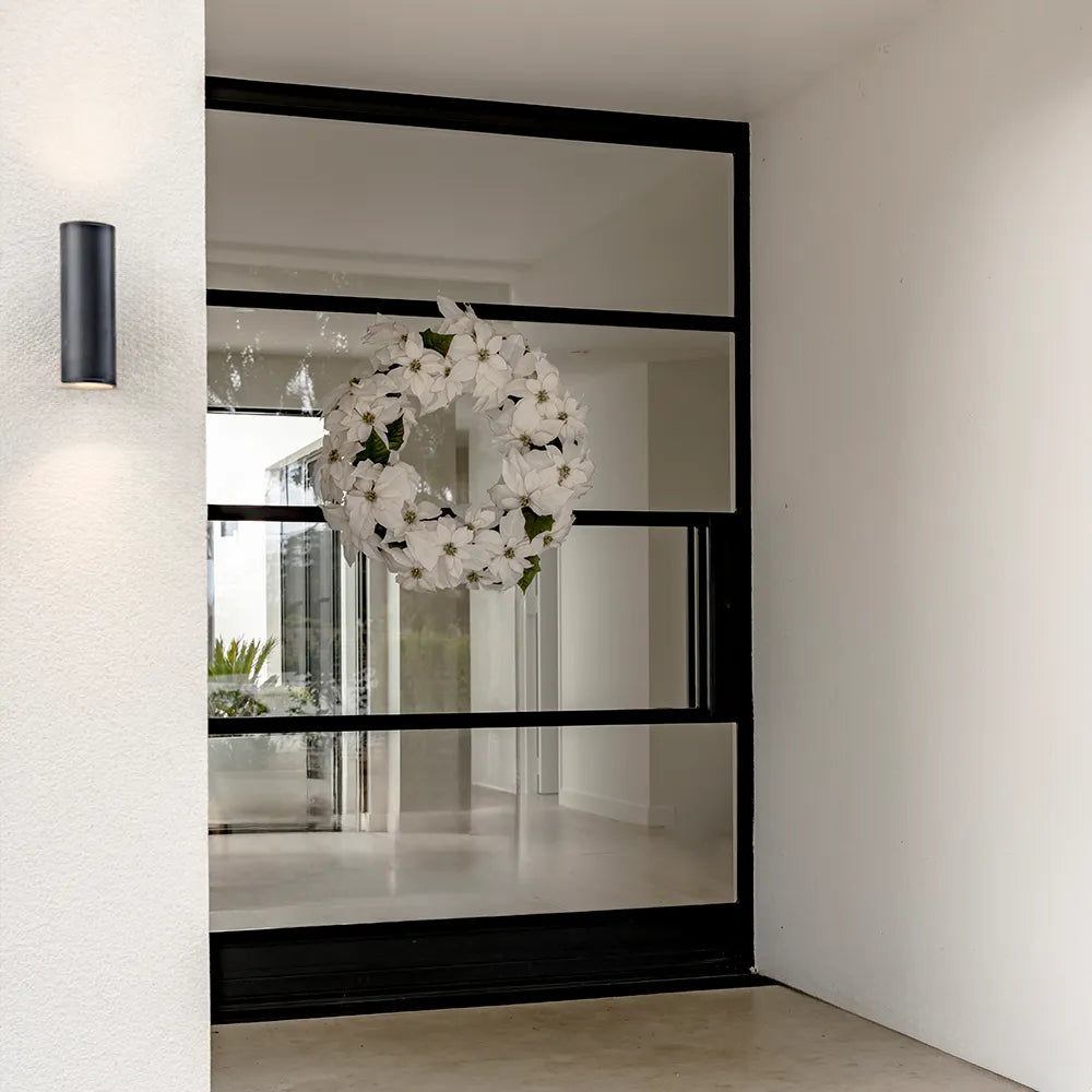 The White Poinsettia Wreath boasts white petals with a sparkling glitter finish, perfect for creating a bold and festive focal point. A stunning way to add warmth and sparkle to your holiday decorations.