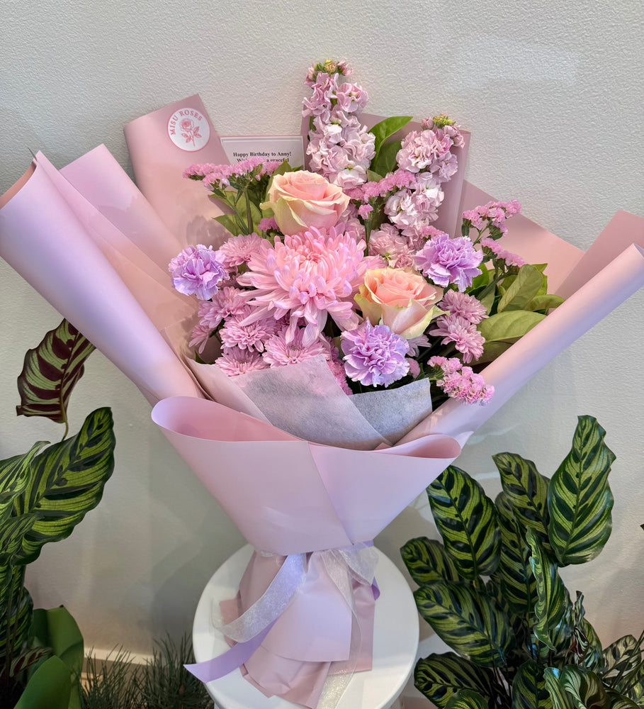 A dreamy blend of pastel florals, this bouquet features lush, oversized chrysanthemums complemented by premium roses and the elegant texture of long-stemmed stocks. Its soft pink tones and gentle mixed blooms create a charming, uplifting arrangement—perfect for birthdays, housewarmings, get-well wishes, or any special celebration.