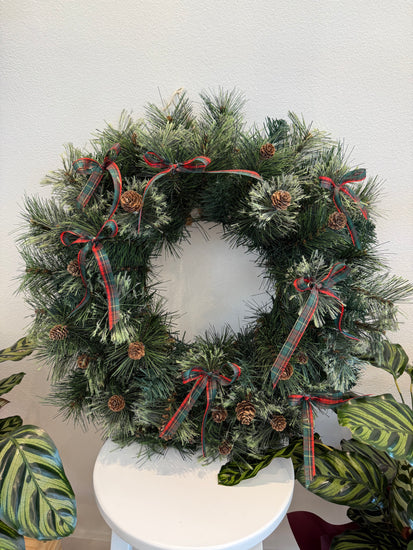 The Wreath made from pine leaves and pinecones features a rich blend of realistic greenery and natural-looking cones. Perfect for adding a rustic, festive touch to your door or mantel this holiday season.